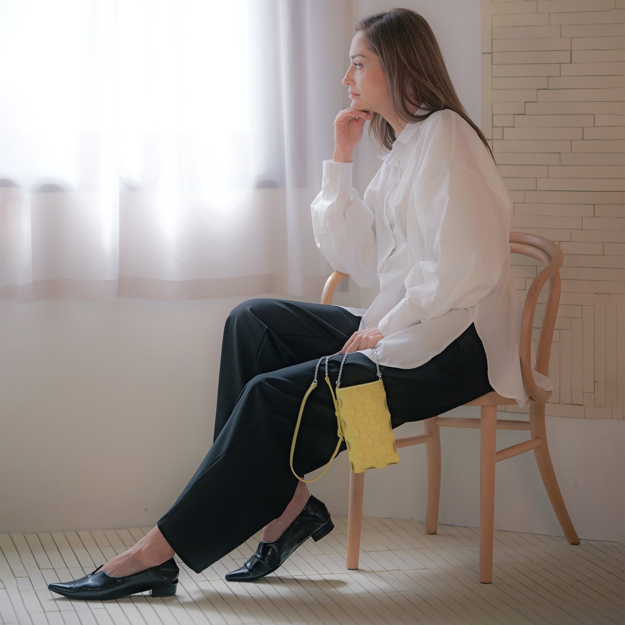 スマートフォン用のショルダーバッグです。ボディは、曲線美を表現したMITTACAの「Weave(ウィーヴ)」パターン。円模様にカットしたレザーを、マイスターの手仕事で編み上げました。漉き工程で厚みをもたせ、光沢と陰翳が際立つよう仕上げています。内装には、カードを収納できるポケットを配置。上質なレザーがもたらす風合いと、細部にまで行き届いた職人技が宿ります。