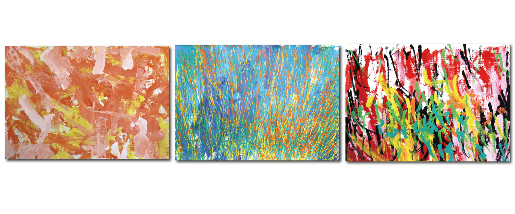 周囲との対話、空気、表情の交わりを通しながら、少しずつ画用紙に刷毛を振り下ろし、線模様を描いていく勝間氏のスタイル。満面の笑みで完成させたという本作は、漆黒の空間で、赤、青、白の炎が争うように噴き上がり、その姿を誇示しているかのよう。