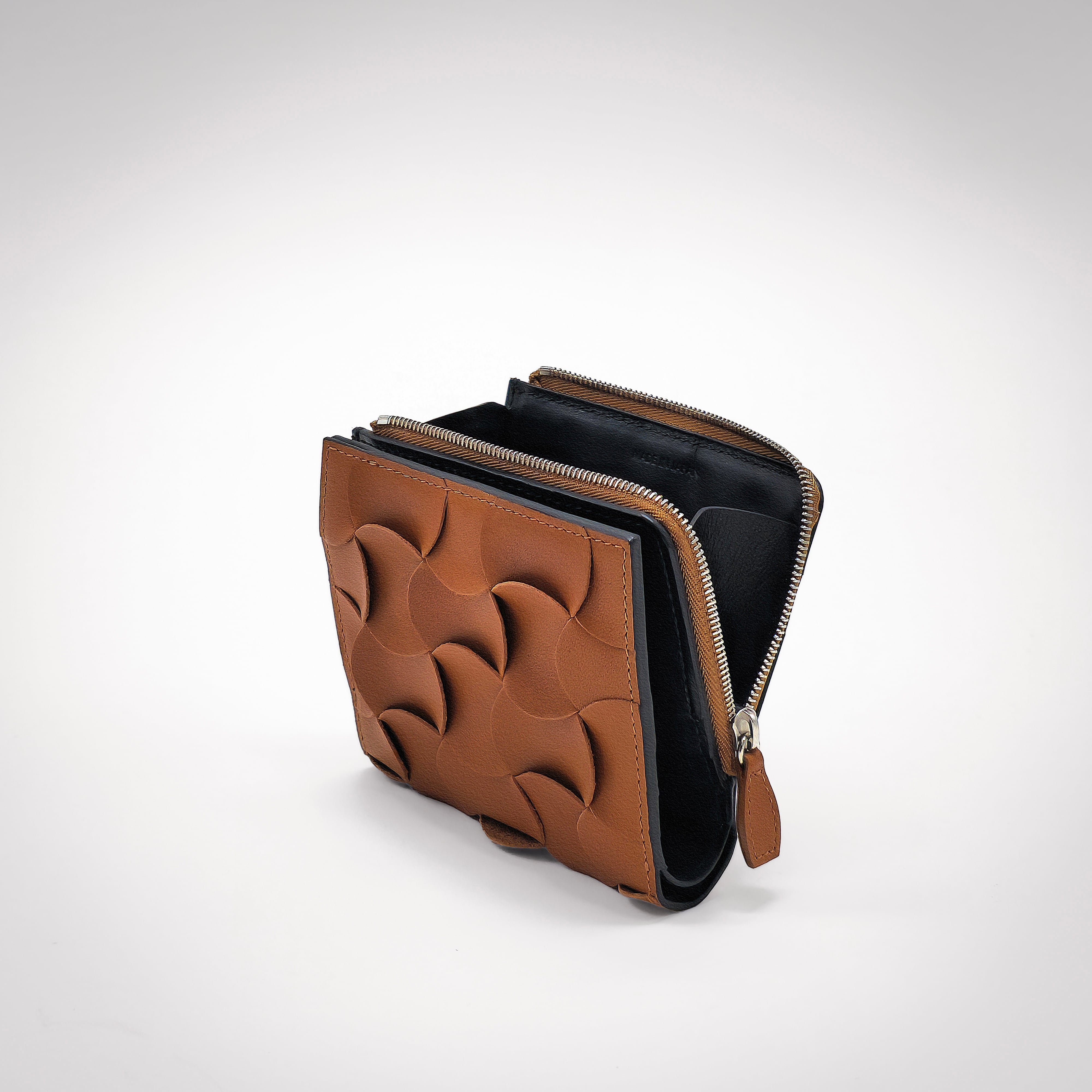 「Weave(ウィーヴ)」パターンの表情が際立つ、二つ折りタイプの財布です。片手に収まるサイズ感でありながら、内装には8段のカードポケット、Lファスナーのコイン収納、札入れを備えています。ポイントに曲線があしらわれ、細部までマイスターの手仕事を感じさせます。