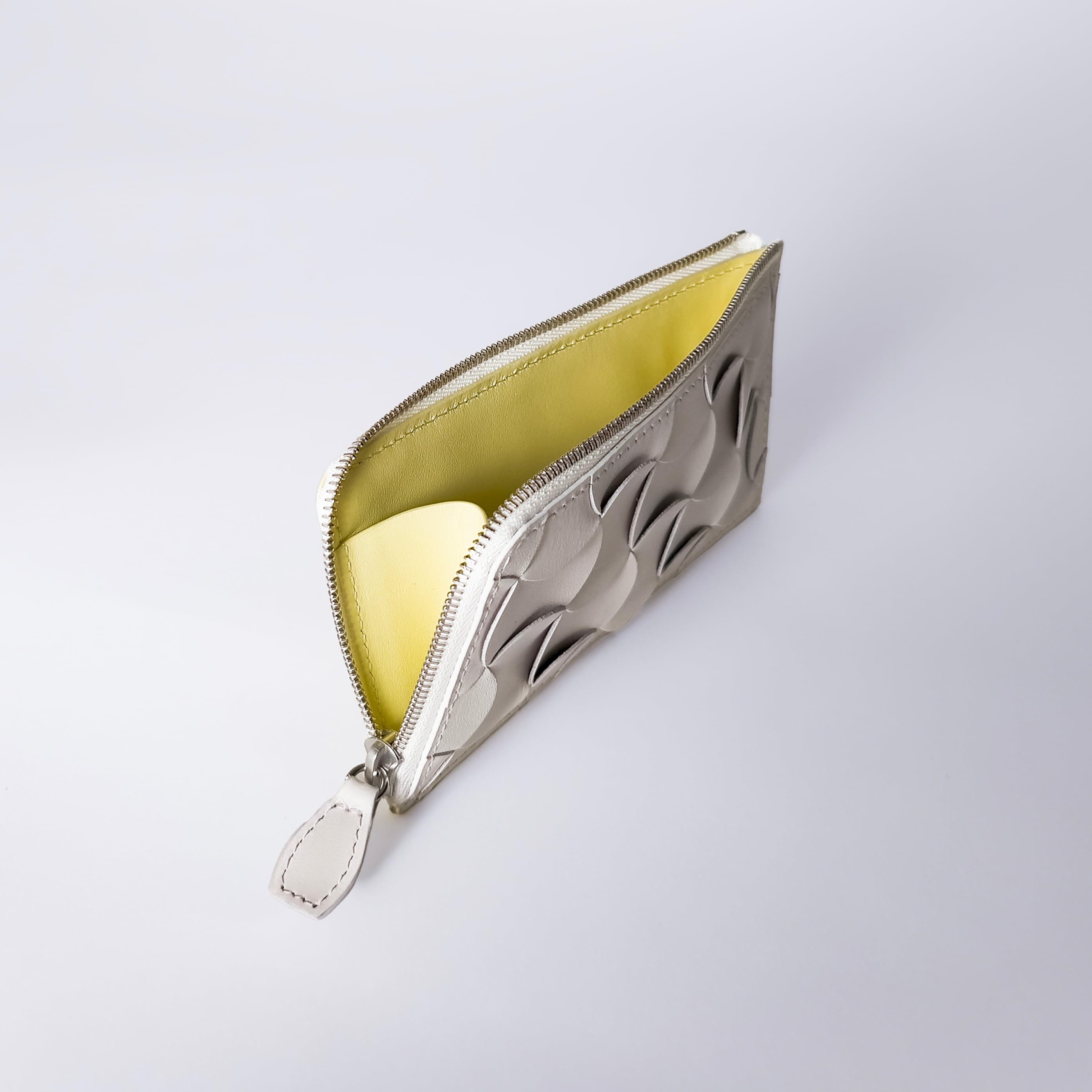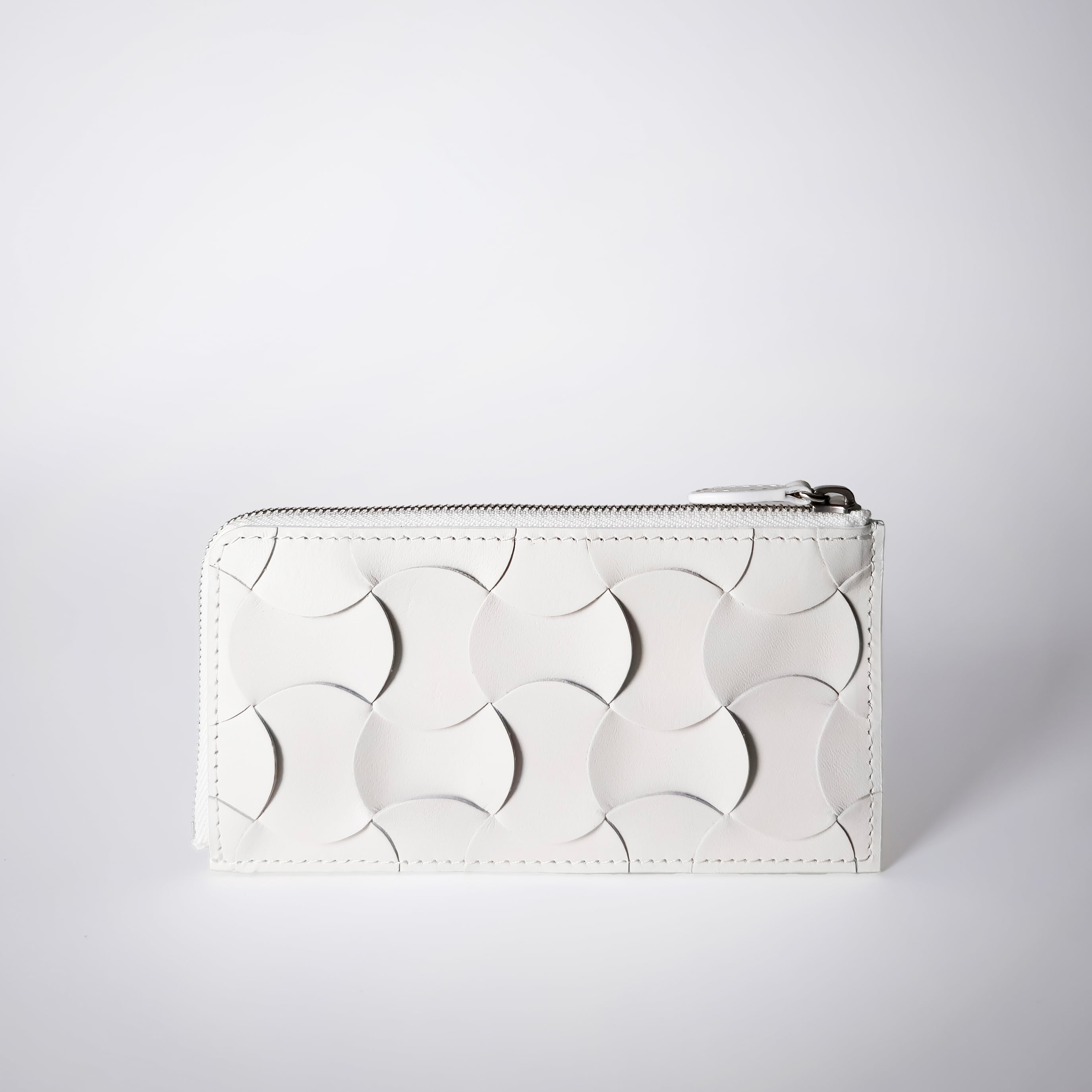 「Weave(ウィーヴ)」パターンの表情が際立つ、スマートタイプの財布です。5段のカードポケットと、Lファスナーのポケットを備え、ポイントに曲線があしらわれています。キャッシュレス等、ミニマルな収納ニーズにフィットする作品です。