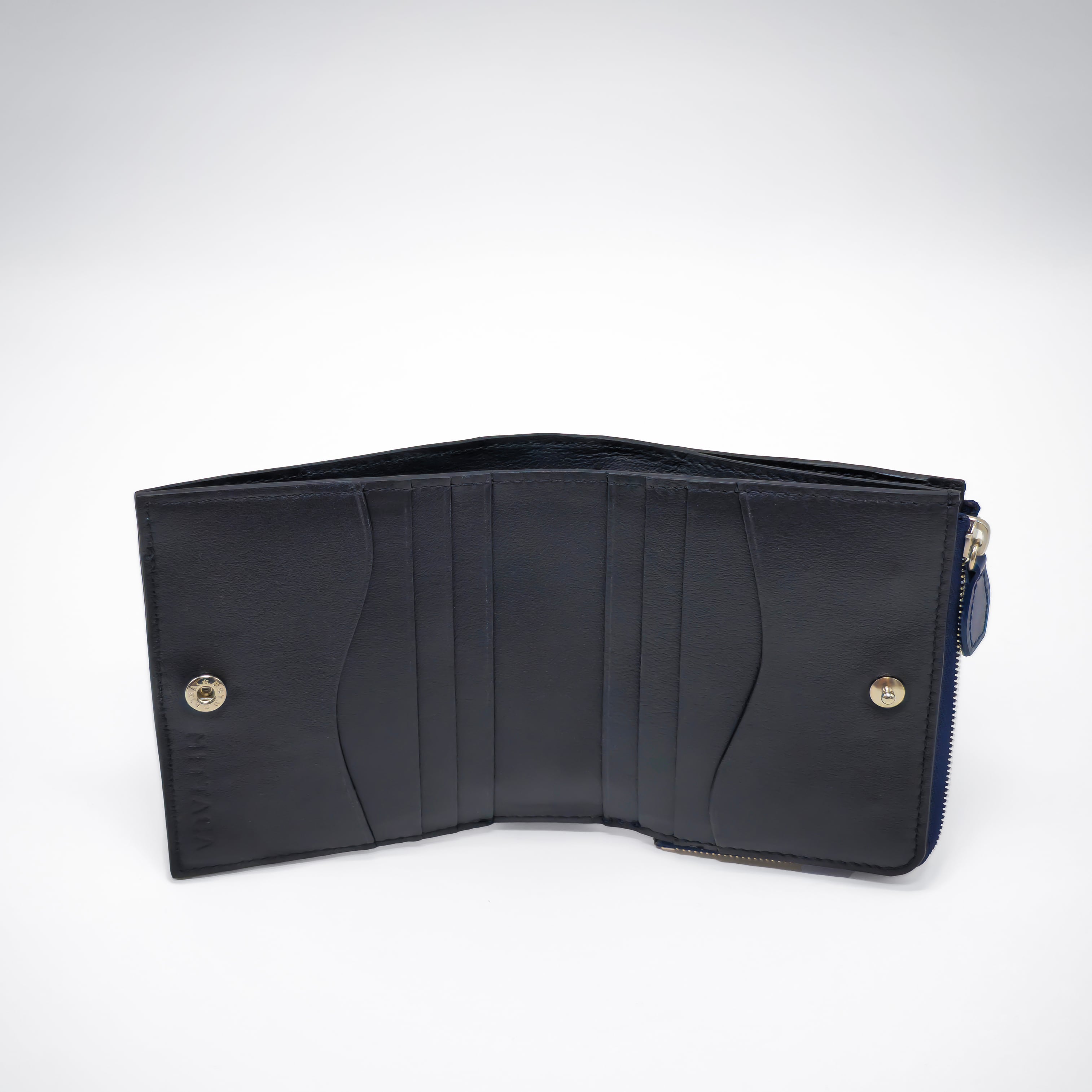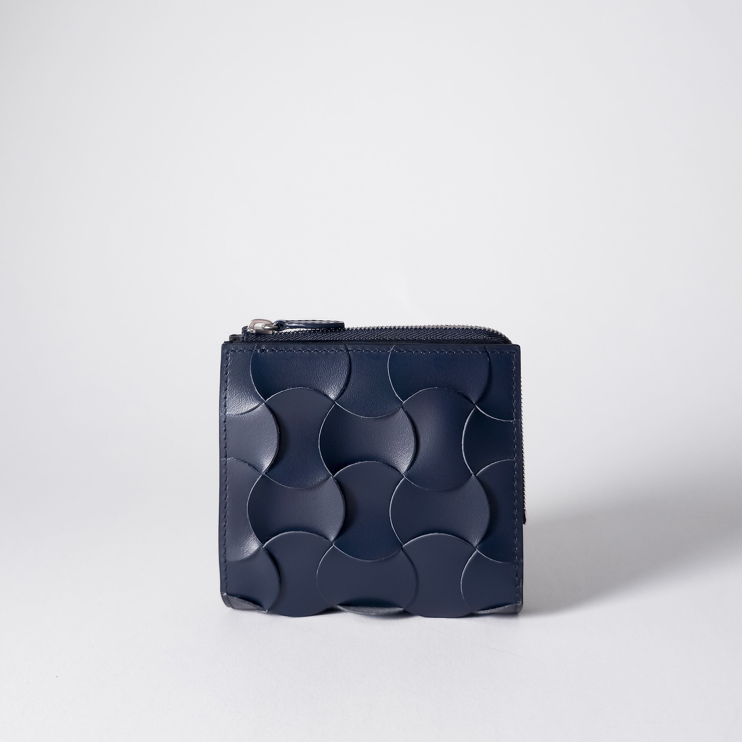 「Weave(ウィーヴ)」パターンの表情が際立つ、二つ折りタイプの財布です。片手に収まるサイズ感でありながら、内装には8段のカードポケット、Lファスナーのコイン収納、札入れを備えています。ポイントに曲線があしらわれ、細部までマイスターの手仕事を感じさせます。