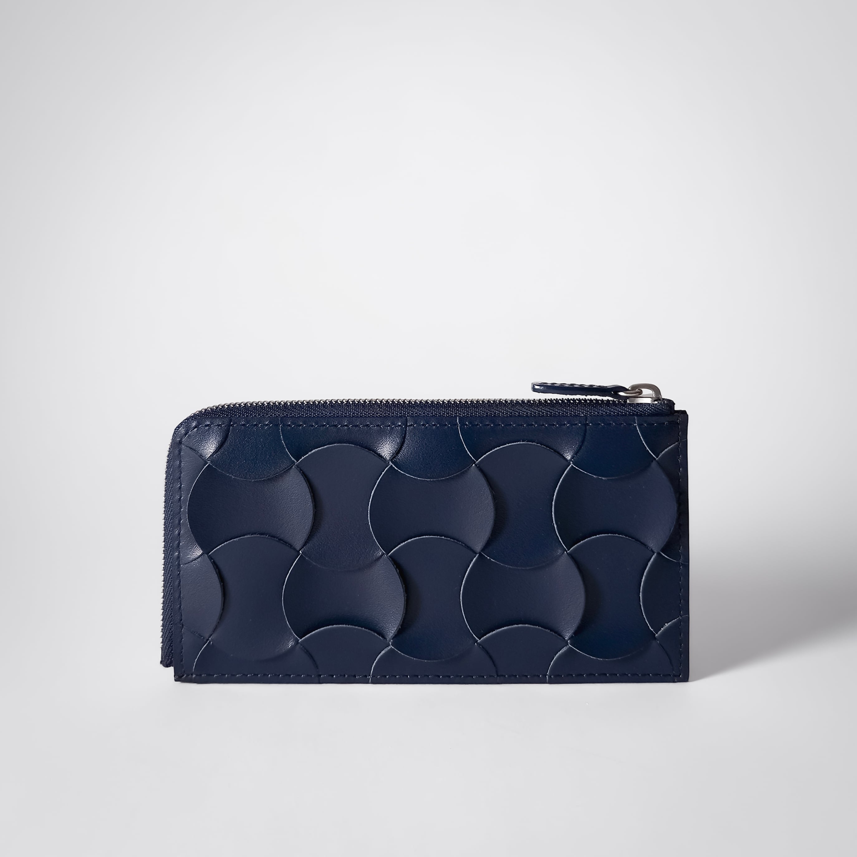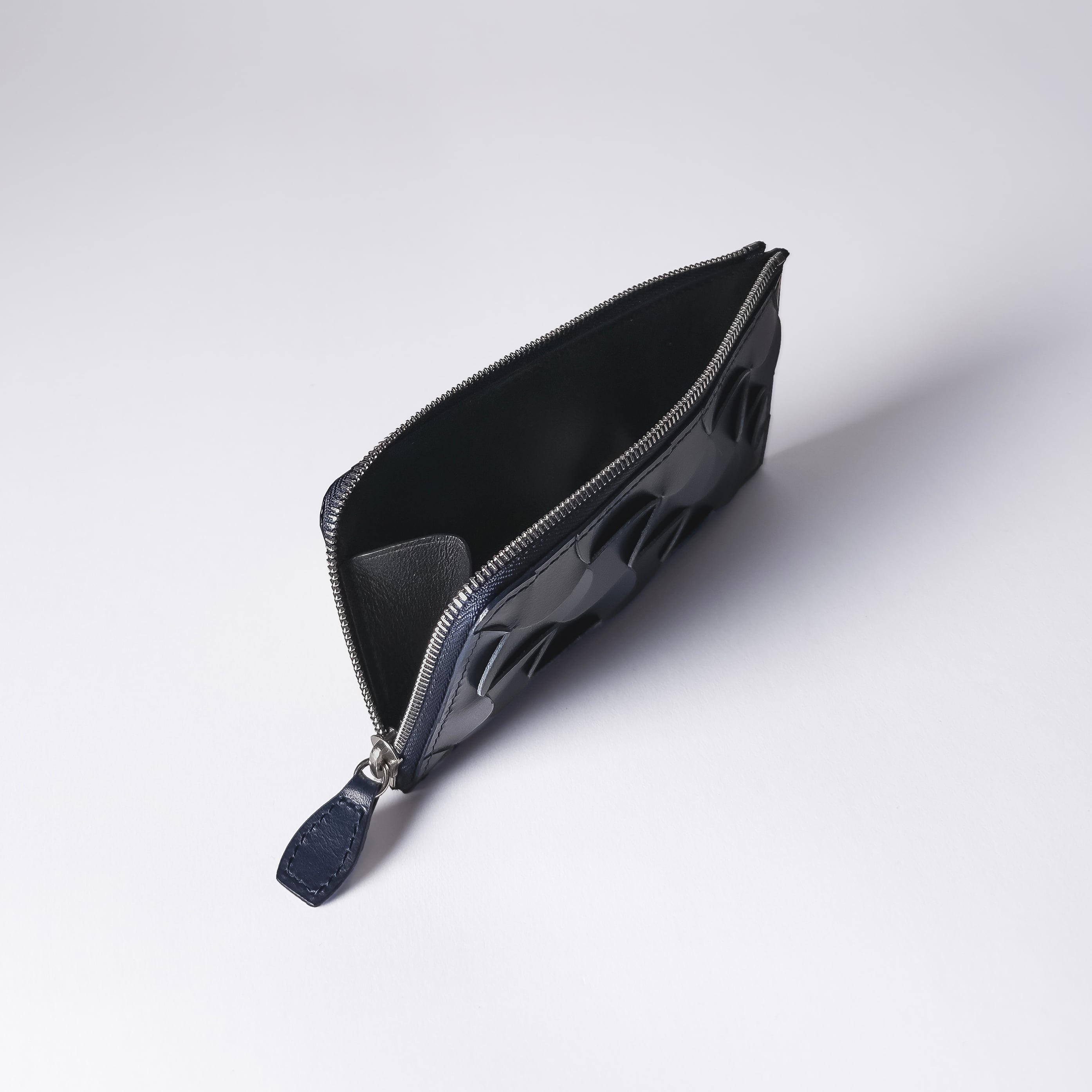 「Weave(ウィーヴ)」パターンの表情が際立つ、スマートタイプの財布です。5段のカードポケットと、Lファスナーのポケットを備え、ポイントに曲線があしらわれています。キャッシュレス等、ミニマルな収納ニーズにフィットする作品です。