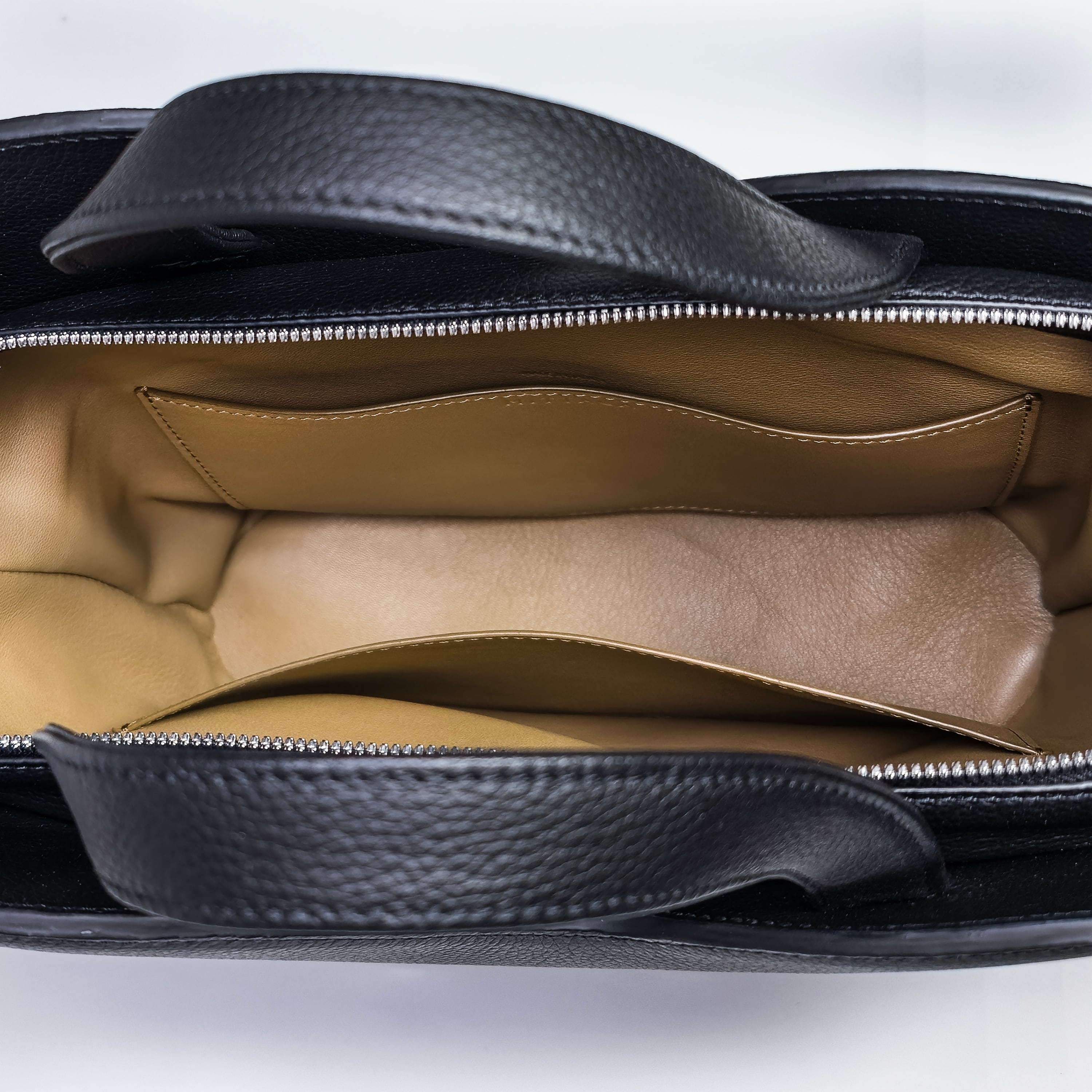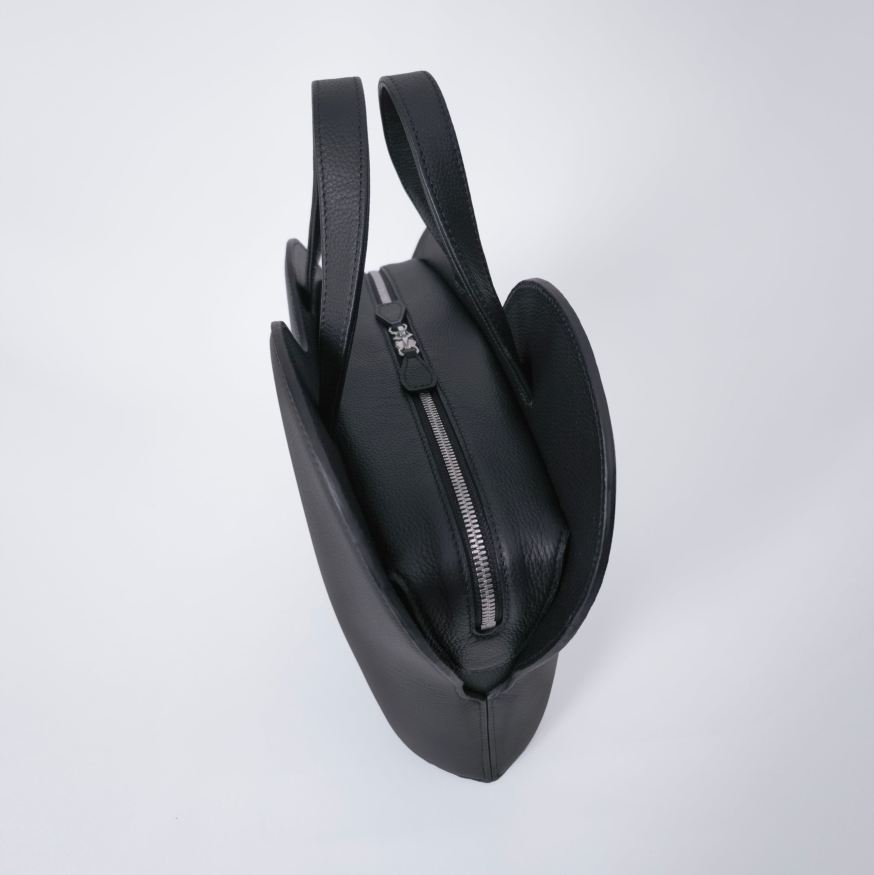 Bayという名の通り、湾曲したカーブ、たおやかなシルエットが目を引くデザインのトートバッグ。ボディには膨らみを出しながら、底面へ向けてシャープになる印象を追求しています。上部のファスナーで開閉し、内装には2つのポケットを備えています。造形を細かく調整しながら、試作を繰り返した職人技が宿ります。