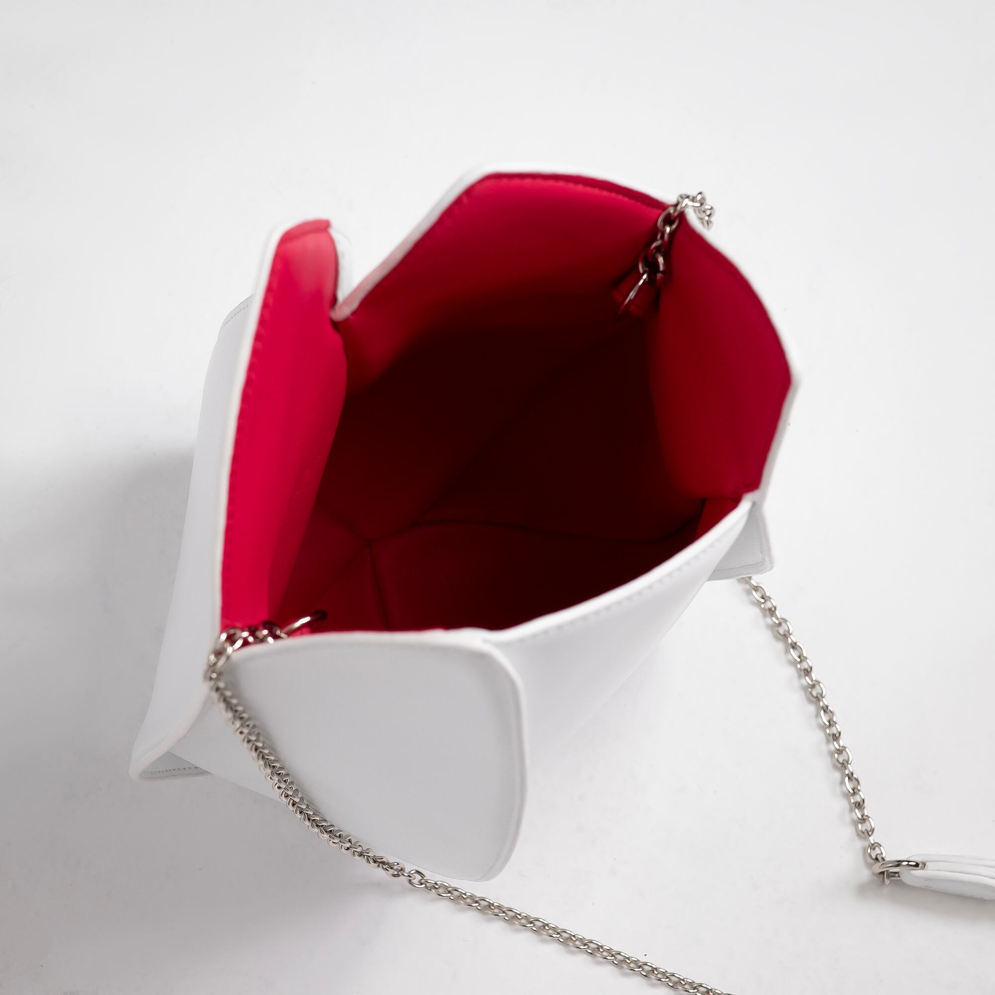 センティフォリア・ローズ(Rose de Mai)の花弁をモチーフとした美しいボディライン、蔓を思わせるパーツとチェーンにより構成された、ショルダータイプのバッグです。イメージの具現化のため、熟練のマイスターによる試作が幾度も繰り返されました。外装のステッチワークを最小限に抑え、揺らぎのない澄んだ表情を生み出しています。