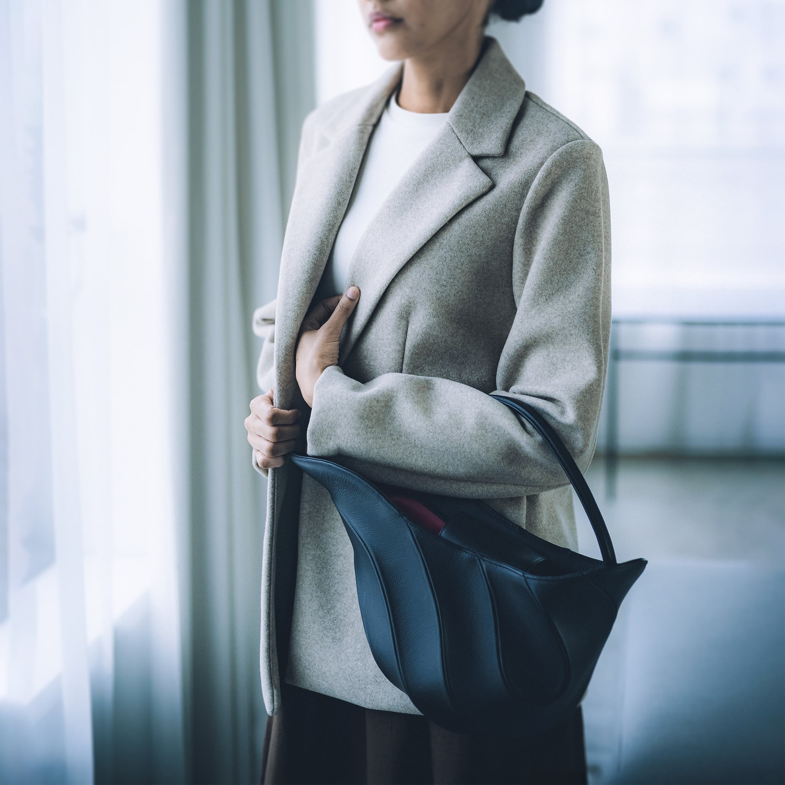 手持ちから肘掛けまで可能な、セミロングのハンドルを備えたハンドバッグです。階層のつなぎ目に主張を加えることで生み出された、MITTACAの「レイヤー」パターン。その型をベースに、有機的な流線形、躍動感のあるフォルムを創造しました。ボディの有機性とは対照的に、直線を意図したハンドルによって、コントラストを際立たせています。
